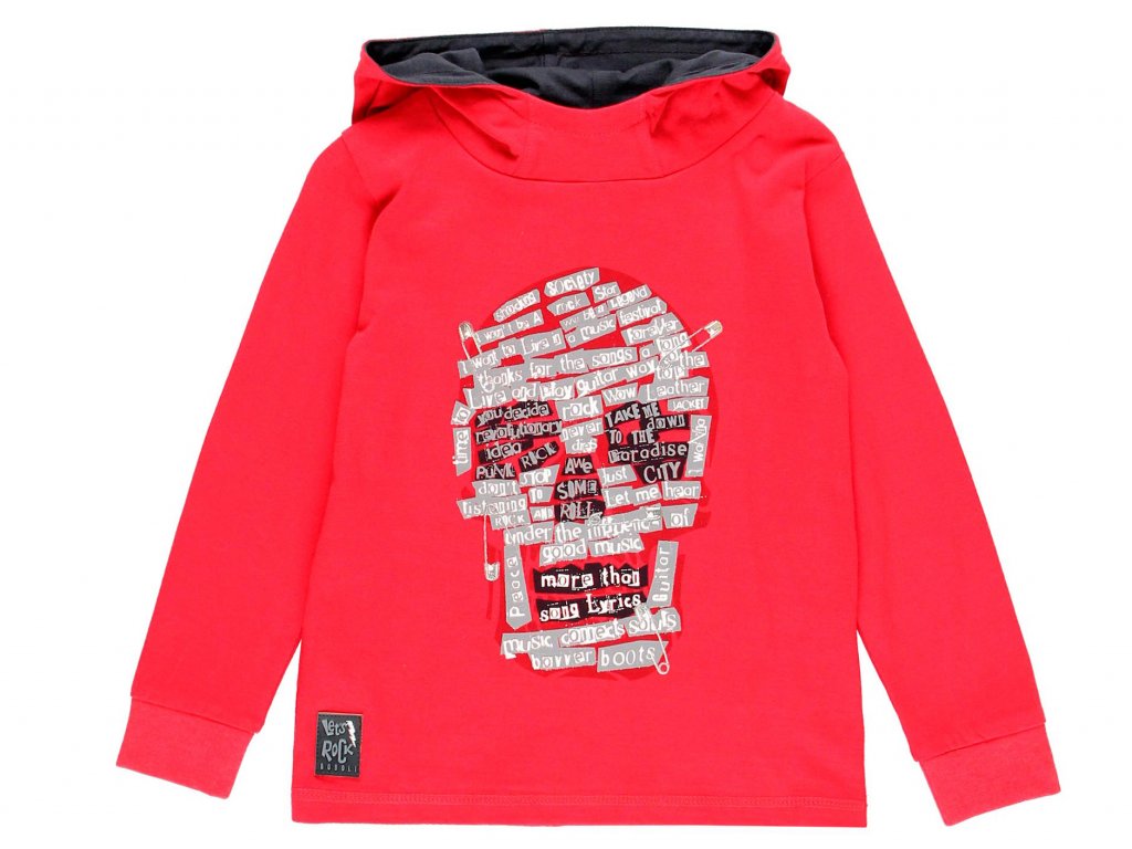 Dětské tričko s dlouhým rukávem a atypickou kapucí s širokým lemem se zajímavým potiskem na hudební téma (lebka, spínací špendlík, koláž). Příjemná 100% bavlna červené barvy v kombinaci černé/antracit. Unisex