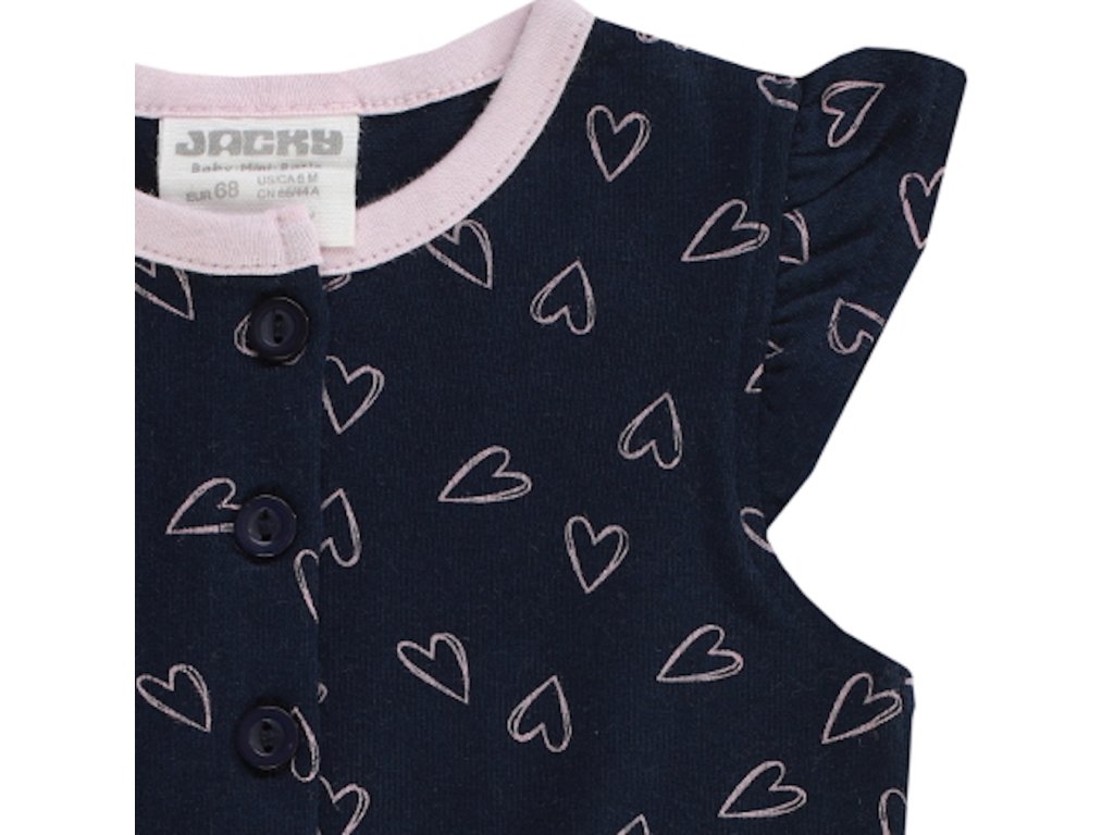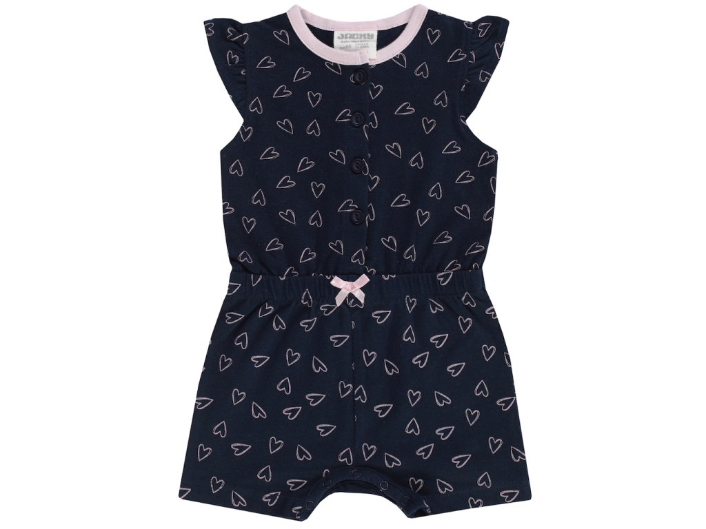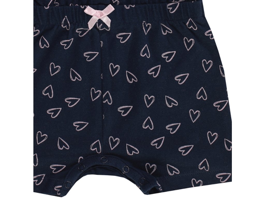 Krátký letní overal pro malou holčičku z pružné bavlny tmavě modré barvy s růžovými srdíčky. Slušivý stříškový rukáv s volánkem, v pase lehounce řasené. Německá kvalita Jacky, OEKO-Tex, VFI Social fair.