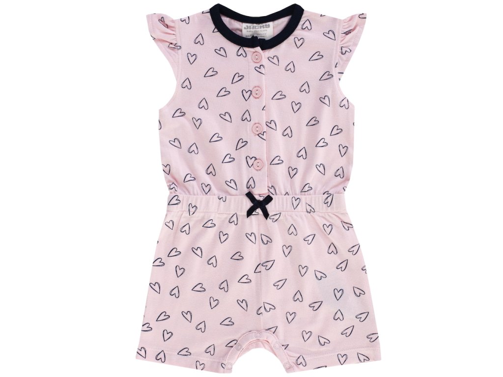 Krátký letní overal pro malou holčičku z pružné bavlny světlounce růžové barvy se srdíčky. Slušivý stříškový rukáv s volánkem, v pase lehounce řasené. Německá kvalita Jacky, OEKO-Tex, VFI Social fair.