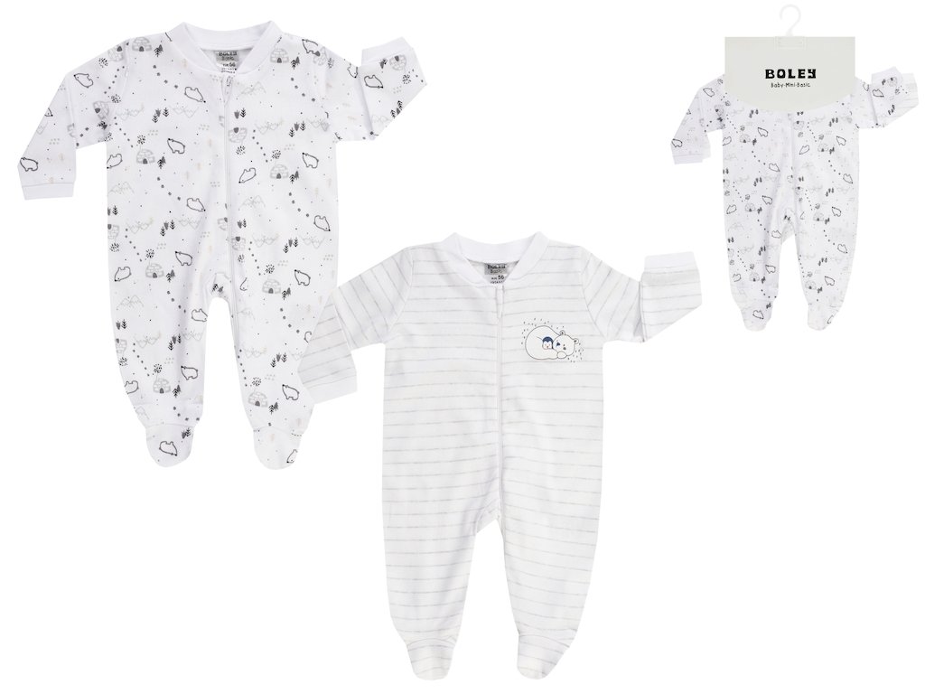 Světlounké pyžámko na zip s tučňáčky a ledními medvíky. Overalek s dlouhým rukávem, nohavicí ťapkou. Jemná 100% bavlna s drobným potiskem nebo proužkem. 2 v balení.