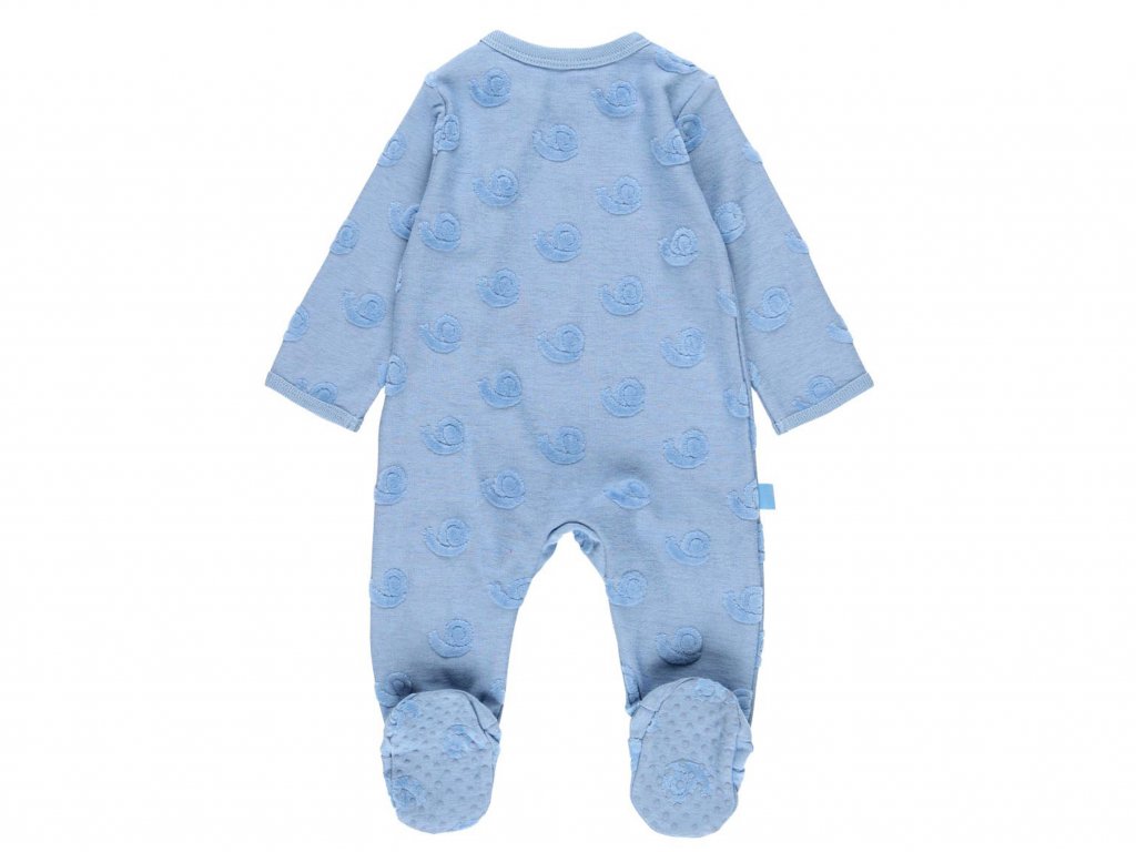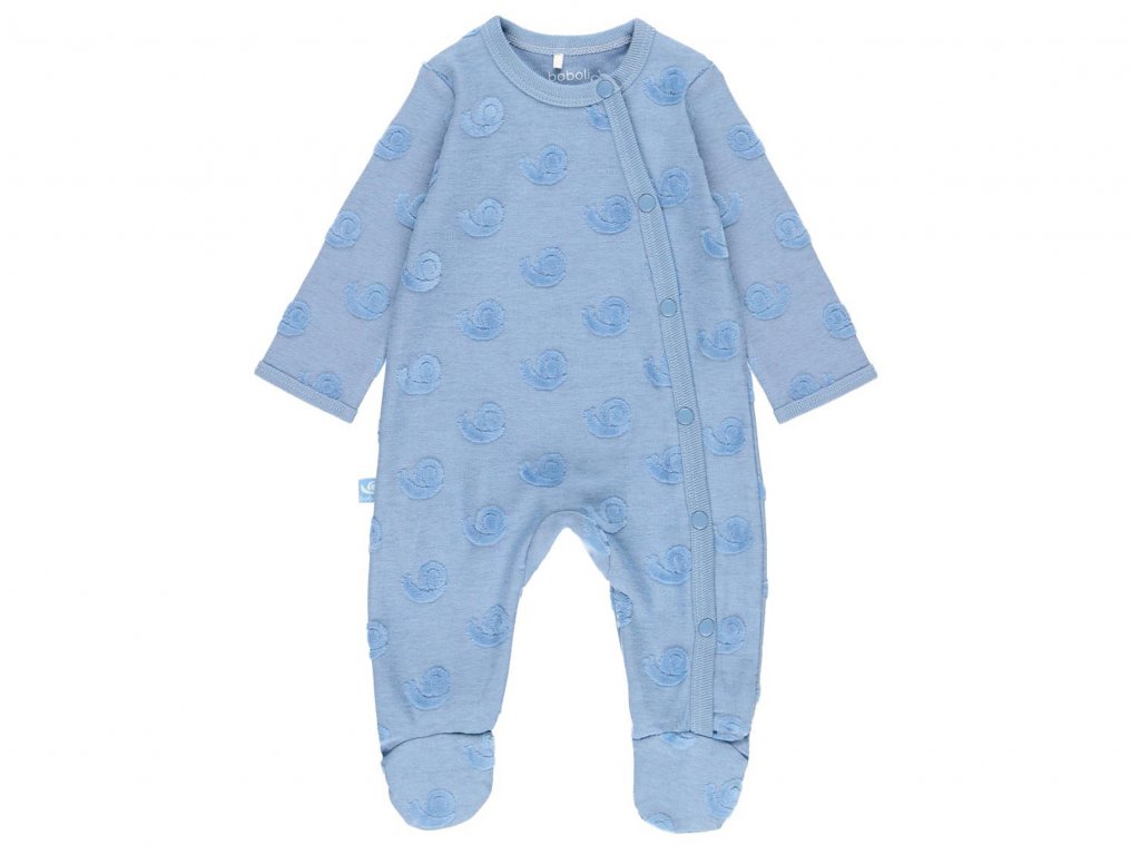 Bavlněný kojenecký overal s dlouhými rukávy a nohavicemi, celopropínací na patentky pro snadné oblékání miminka. Nebesky modrá barva se sametovými výšivkami šnečků pro chlapečka. OEKO-TEX certifikát.