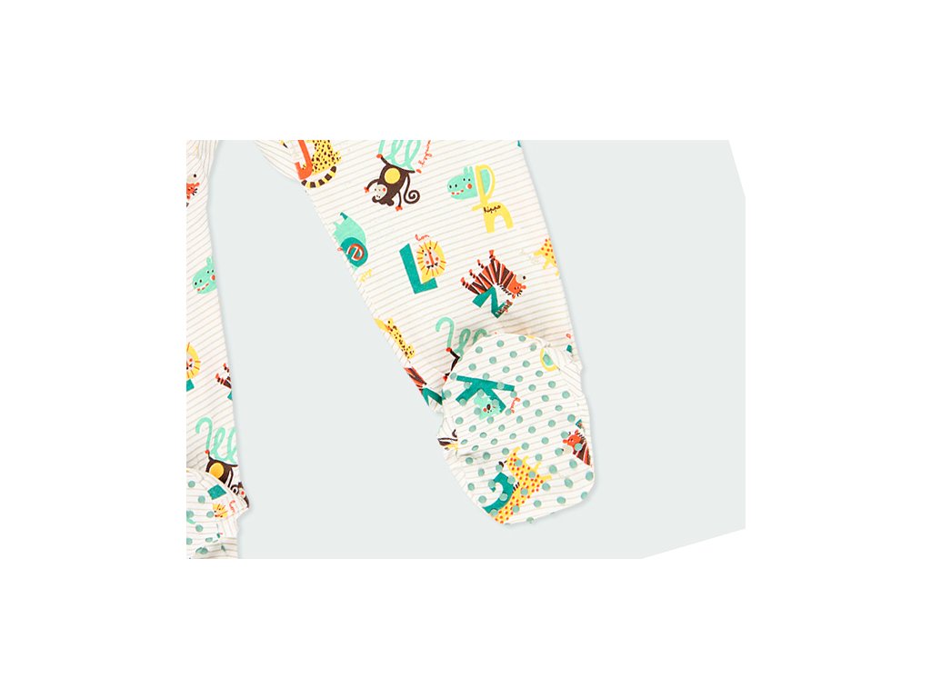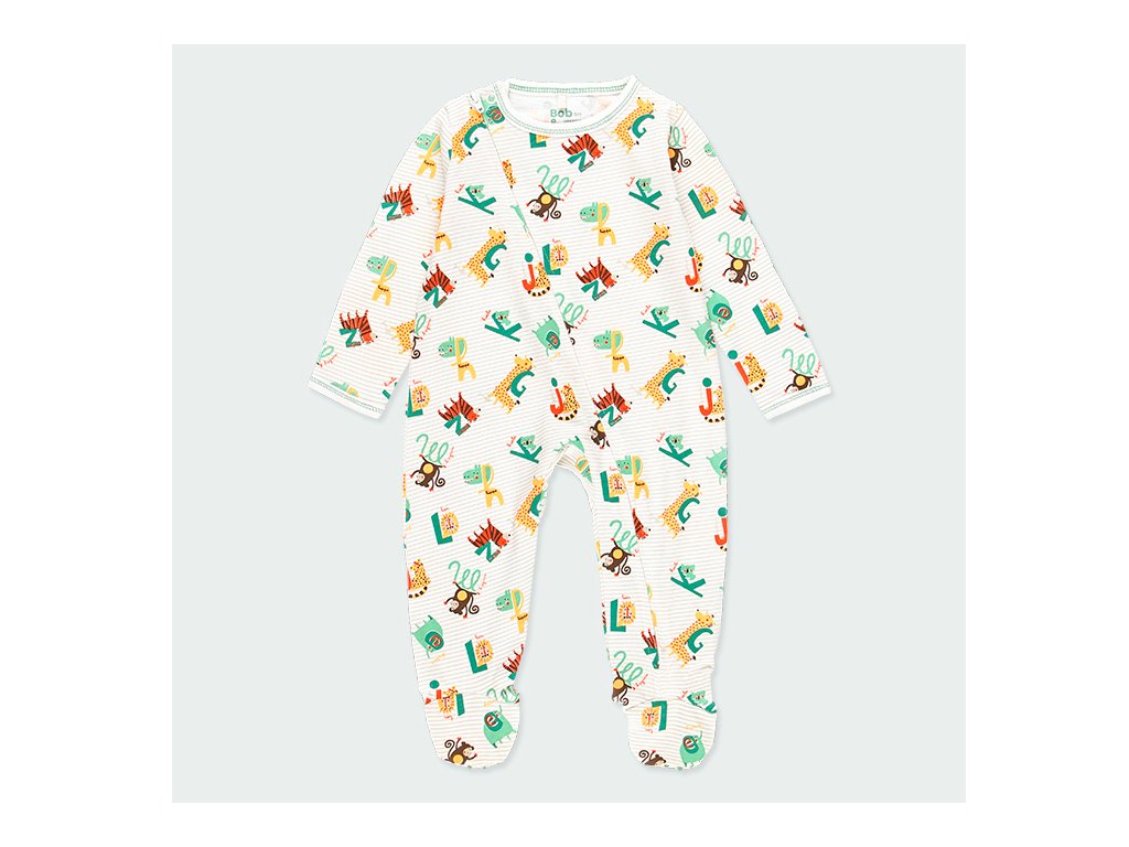 Roztomilý kojenecký overal nebo pyžámko pro miminko, z jemné bílé bio bavlny s barevnými zvířátky z Afriky a džungle. Dlouhý rukáv a nohavice s ťapkami s protiskluzem. Rozepínání na zip a patentku u krku. GOTS certifikát.