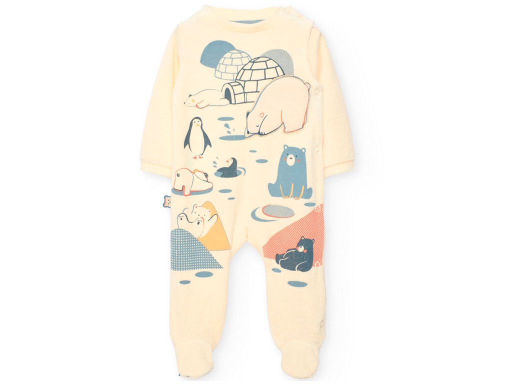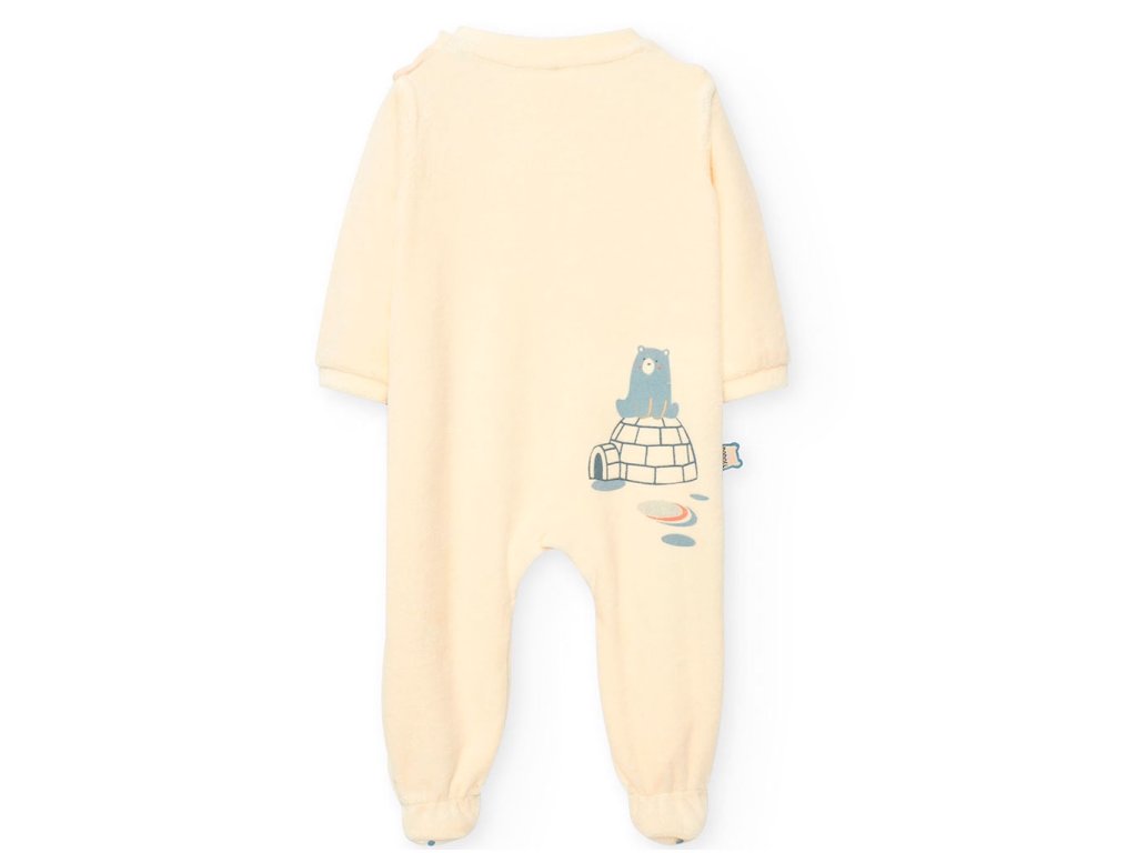 Pružný kojenecký overal z jemného sametu krémově bílé barvy (bavlněný velur) s dlouhými rukávy a nohavicemi, celopropínací na patentky pro snadné oblékání miminka. Nášivka a potisk ledního medvídka. Unisex. Boboli Španělsko.