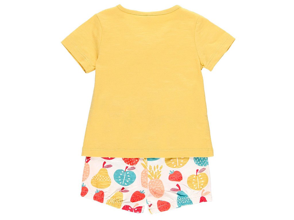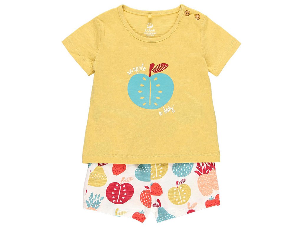 Žluté tričko s krátkým rukávem a kraťasy s barevným potiskem symbolů ovoce ze 100% organické bavlny. Unisex. Velmi příjemný letní outfit pro miminko. Kolekce Organic od Boboli