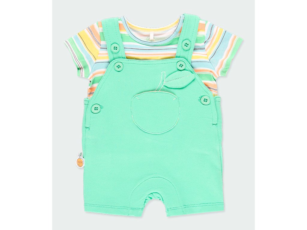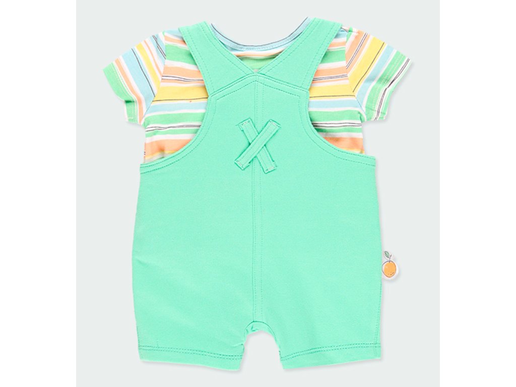 Letní set pro miminko - mentolově zelené kraťásky s laclem a barevně pruhované tričko s krátkým rukávem pro batole do 2 let. Do setu s oboustrannou mikinkou a bryndáčky. OEKO-TEX certifikát, Amfori udržitelná móda od Boboli.