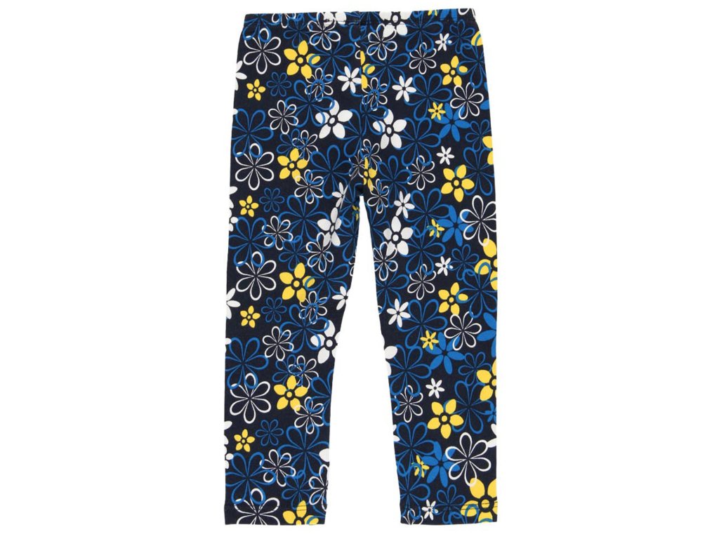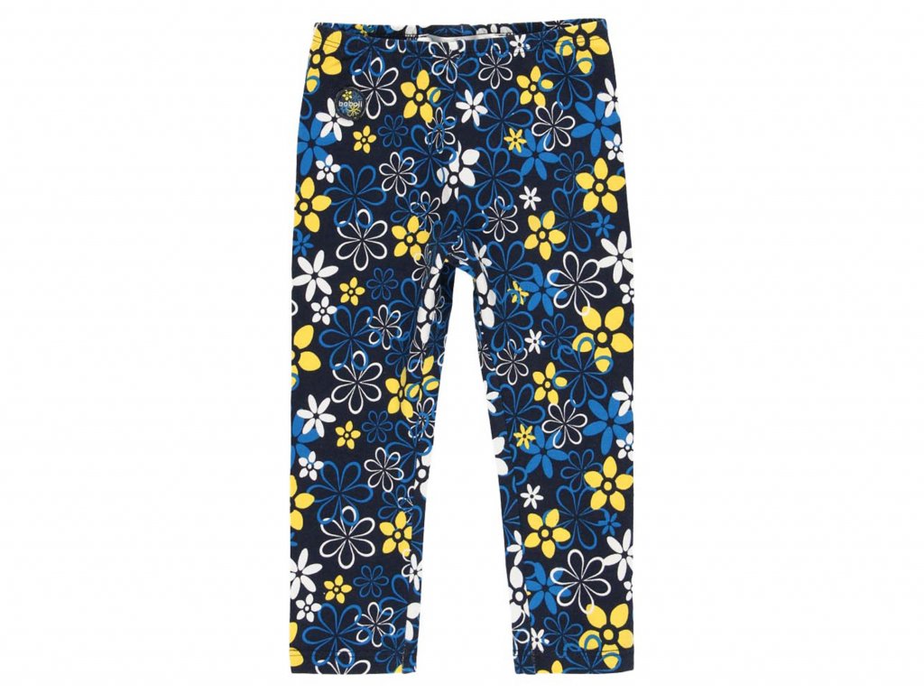 Jemné strečové legíny pro holčičku, v tmavomodré barvě s bílými a žlutými květy. Velmi příjemná a pružná bavlna s kvalitním sítotiskem. Květinová kolekce od Boboli.