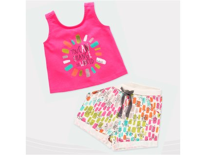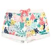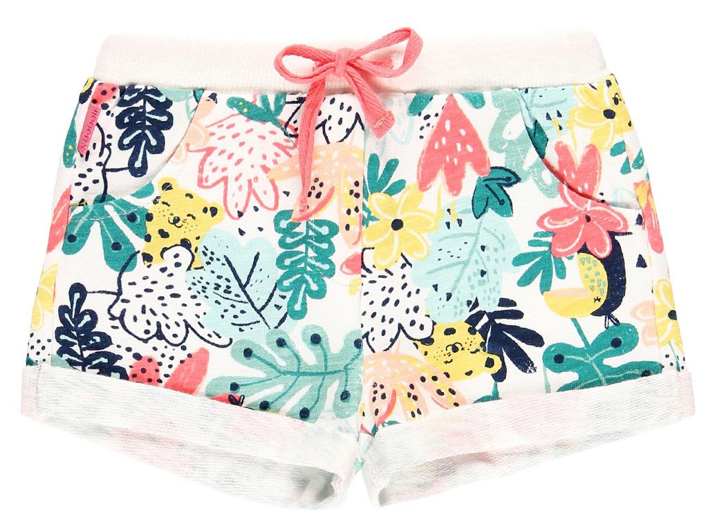 Teplákové dívčí kraťasy s kapsami a barevným potiskem květů a listů. Ideální outfit pro celodenní letní radovánky, velmi komfortní a příjemný materiál ze 100% bavlny. Bílé šortky s potiskem růžové, modré, zelené, lososově růžové a žluté barvě. Kolekce Květy a Listy a Tropical.