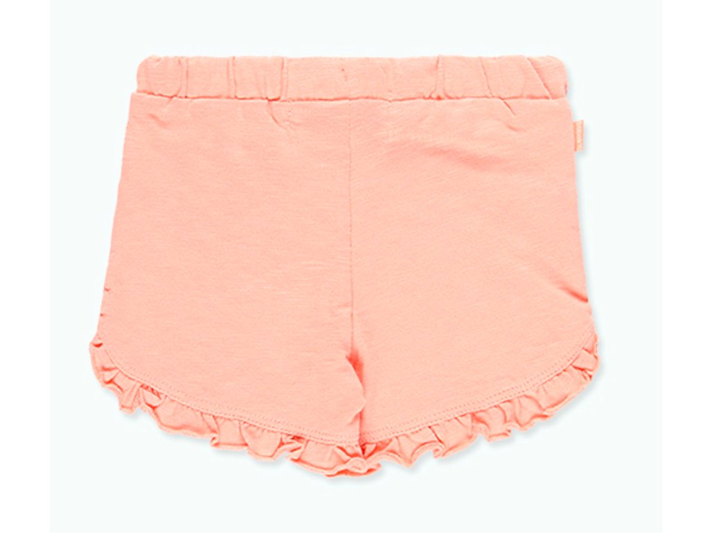 Lososově růžové kraťásky s volánky pro holčičku do 6 let. Příjemná a pružná bavlna. OEKO-TEX certifikát. Amfori udržitelná móda od Boboli.