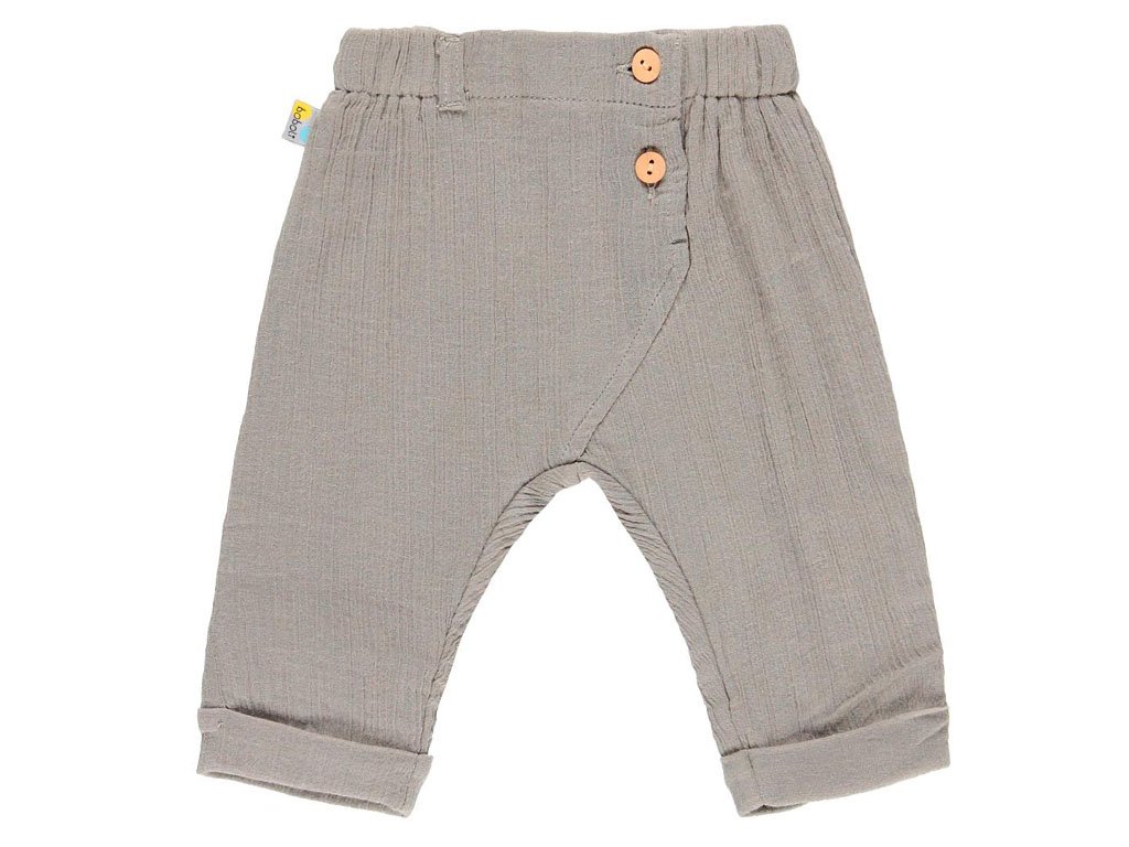 Dětské kalhoty či tepláčky širokého sedu z dvouvrstvé 100% bavlny světle šedé barvy. Svrchní vrstva z jemné mačkané látky, velmi příjemné. V pase na širokou pružnou gumu i s poutky. Asymetrický poklopec s rozepínáním na dva dřevěné knoflíčky. Do setu s tričkem.
