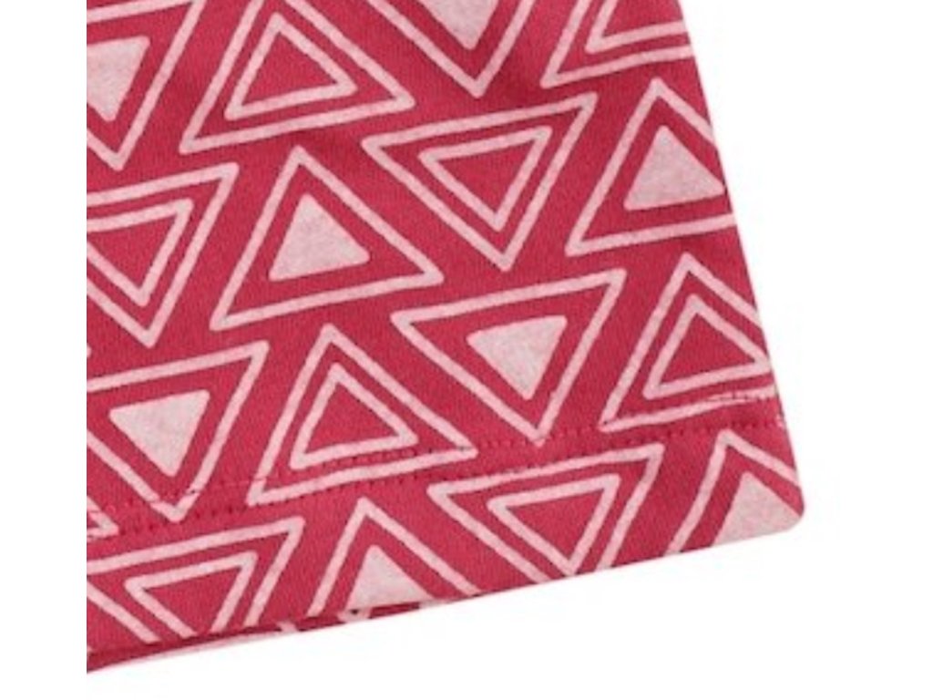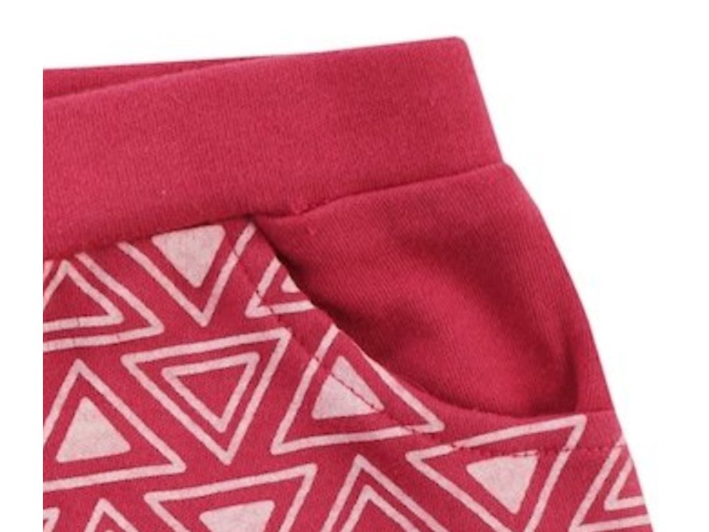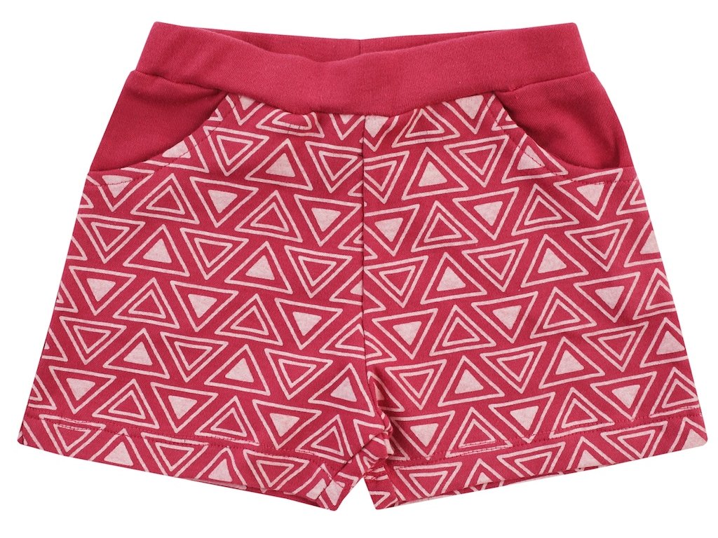 Krásné, malinově červené šortky pro miminko a batole, v pase jemně řasené, na širokou gumu,. Bavlněné kraťasy s kapsičkami a geometrickým potiskem. 100% bavlna. OEKO-TEX standard 100 certified. VFI social standard.