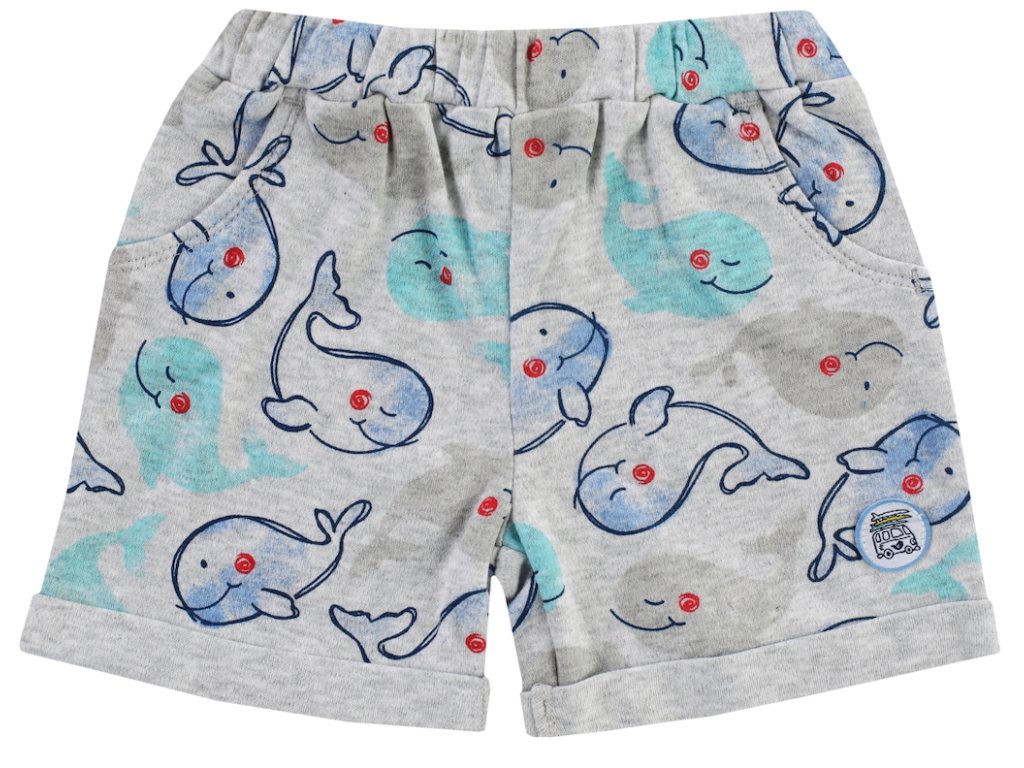 Krátké kraťásky z příjemné 100% bavlny světle šedé barvy, zdobené potiskem veselých velryb pro krásný odpočinek. OEKO-TEX Standard 100 certifikát. VFI Social fair.
