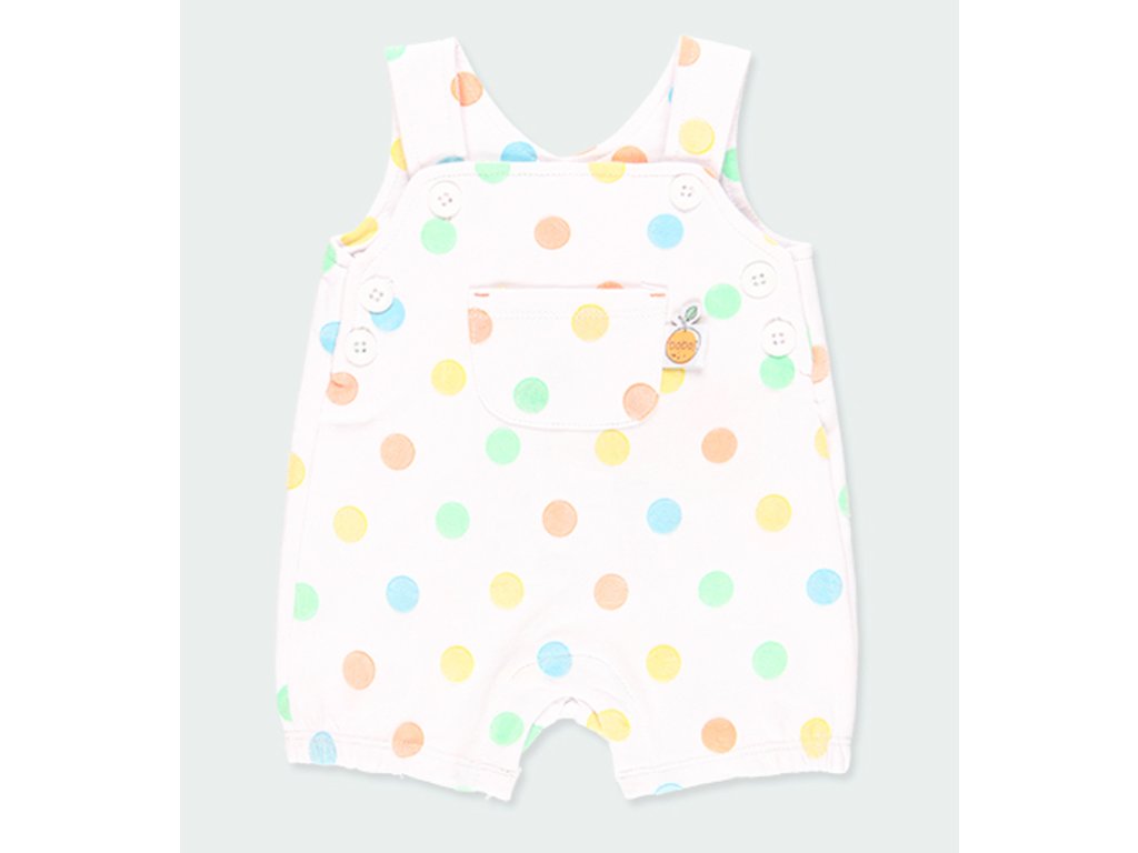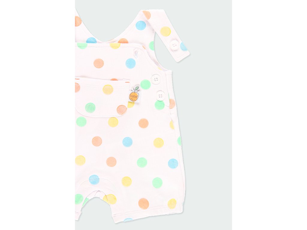 Krátké lacláčky z bílé bavlny s barevnými puntíčky pro holčičku i chlapečka do 2 let. Lacly a boky se zapínáním na knoflíčky, spodem na patentky. Do setu s tričkem a oboustrannou mikinkou. OEKO-TEX certifikát, Amfori udržitelná móda od Boboli.