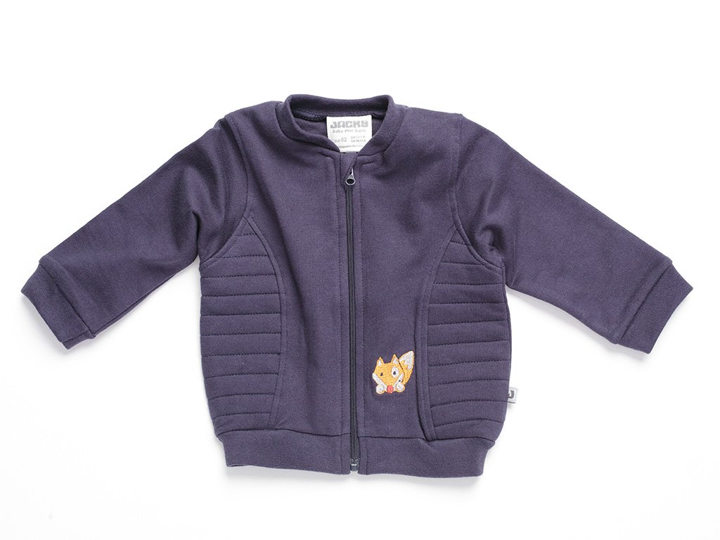 Tmavá kojenecká mikina na zip s polstrovanými stranami a výšivkou lišáka (liška). 100% bavlna. EKO-TEX Standard 100 certifikát. VFI Social fair.