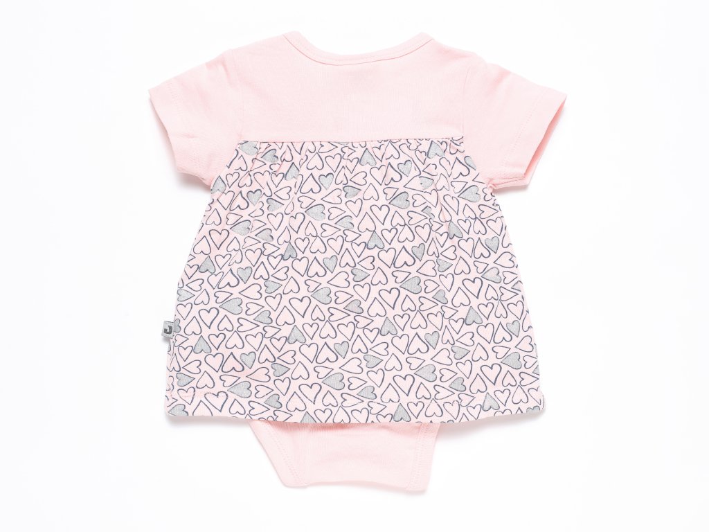 Kombinované body z jemné bavlny se šatičkami s krátkým rukávem a s jemným celoplošným potiskem srdíček v kombinaci staro růžové a třpytivě šedé (shimmer). EKO-TEX Standard 100 certifikát. VFI Social fair.