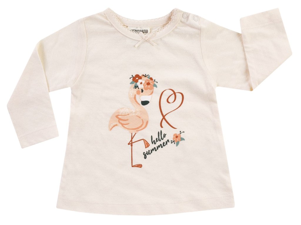 Světlounce růžové tričko pro holčičku, s dlouhým rukávem a jemným plameňáčkem. 100% bavlna s drobným elegantním vzorkem a zdobným lemem. Do setu s tepláčky a zapínací mikinkou. OEKO-TEX certifikát.