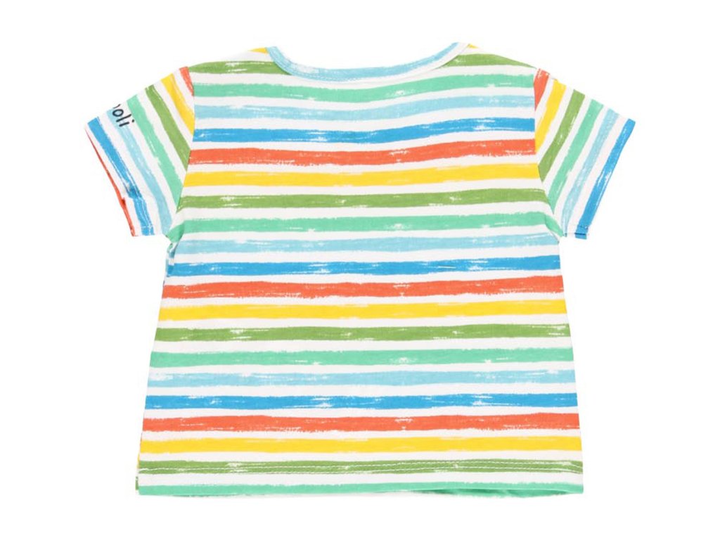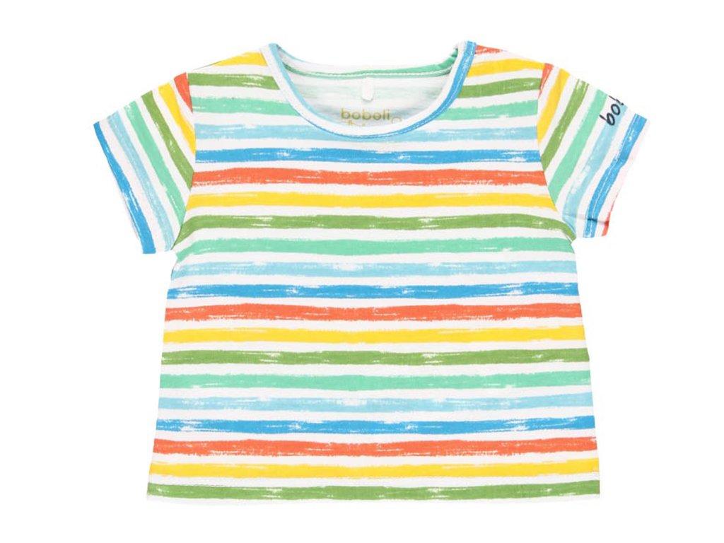 Dětské tričko s krátkým rukávem ze 100% bavlny, pruhované veselými barvami žluté, zelené, modré a oranžové. OEKO-TEX Standard 100 certifikát. Do setu k teplákové soupravičce.