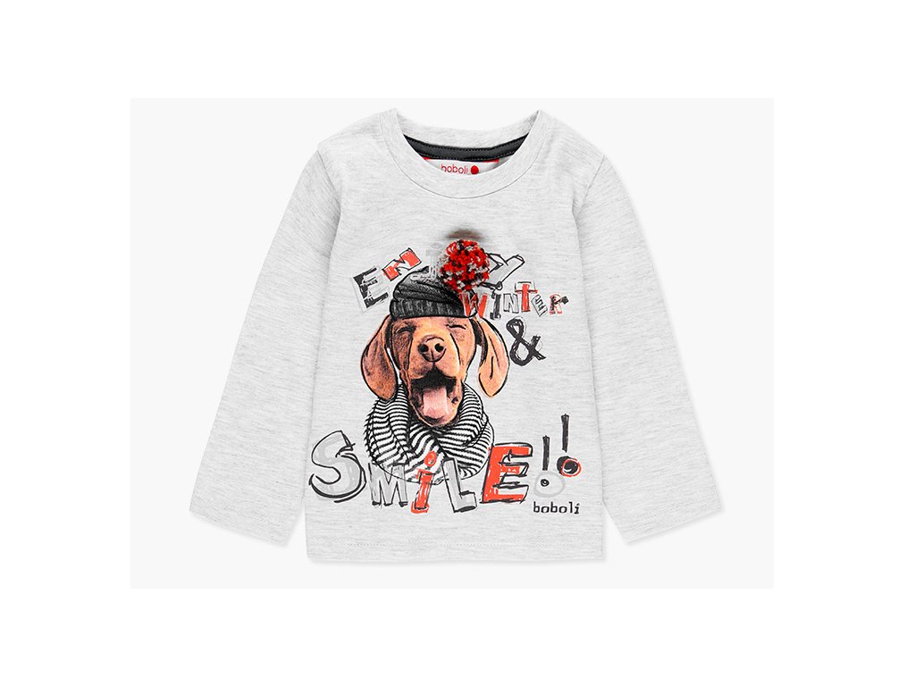 Dětské tričko s dlouhým rukávem z jemné bavlny, s potiskem usmívajícího se psa v zimní čepici, pruhované šále a s opravdovou bambulí (šťastný pes).