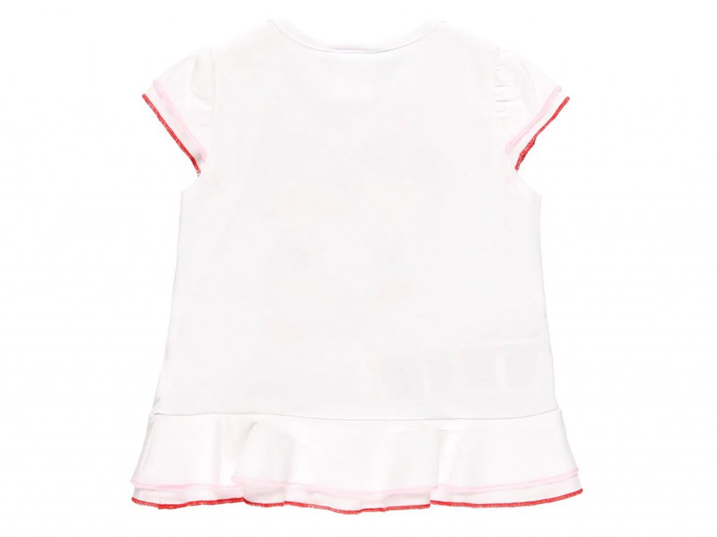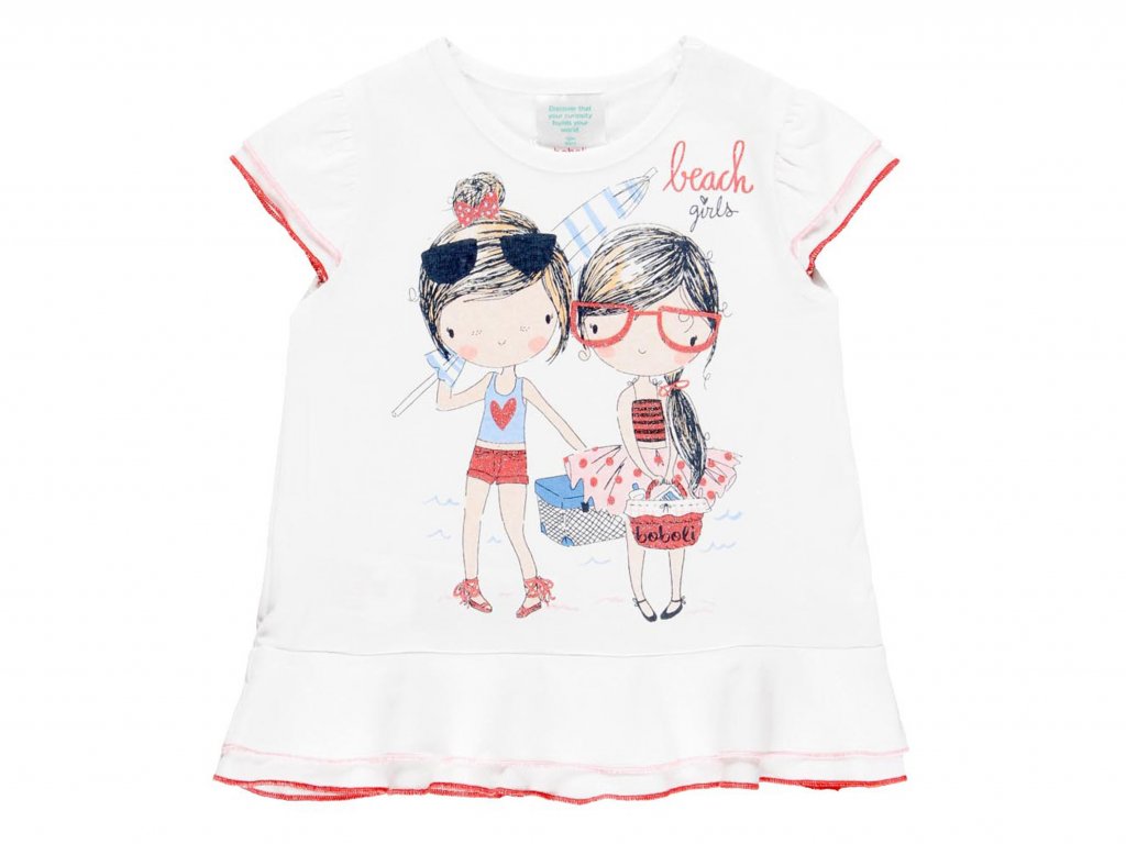 Velmi příjemné tričko nebo krátké letní šaty pro malou princeznu. Bílé tričko se stříškovým rukávkem a dvojitými volánky ze 100% bavlny, zdobené třpytkami s něžným potiskem holčiček u moře.