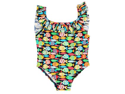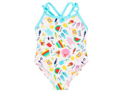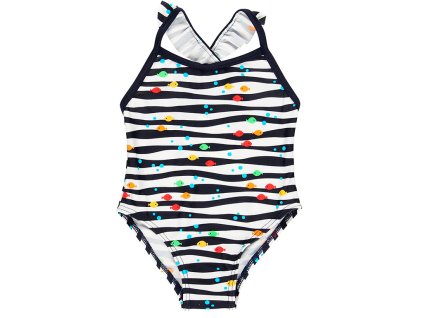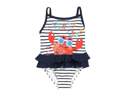 Veselé plavky pro holčičku, bílé s tmavě modrým proužkem a na zadečku s potiskem plážového kraba s hravými klepety. Po stranách se slušivými volánky. Velmi příjemný rychleschnoucí materiál (lycra Extra lifeTM vlákno). S praktickou taštičkou. Do setu s plážovou osuškou, froté pončem.