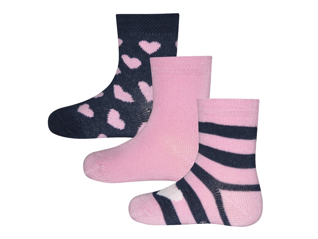 Dětské ponožky pro holčičku do 2 let, s širokým pružným lemem a ve třech různých barevných kombinací tmavě modré a růžové, s proužky nebo srdíčky.