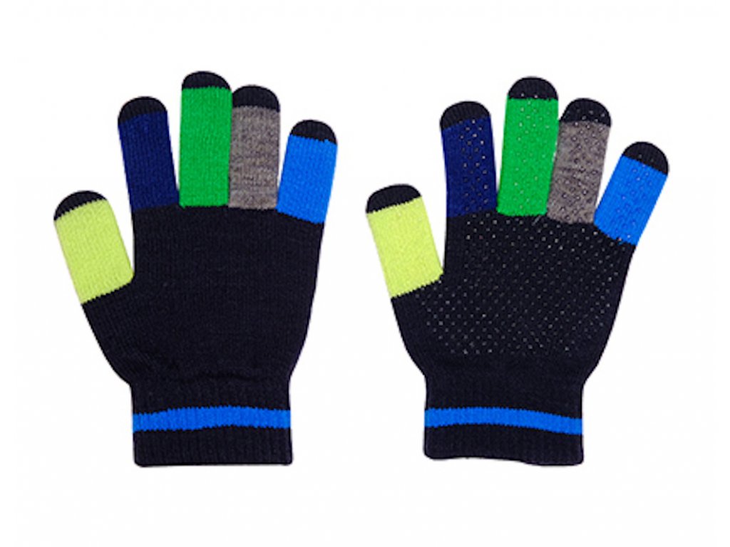 Dětské rukavice z jemné pleteniny a s protiskluzovými tečkami na dlani. Tmavě modré rukavice s každým prstem jinak barevným pro kluka i holku od 5ti let.