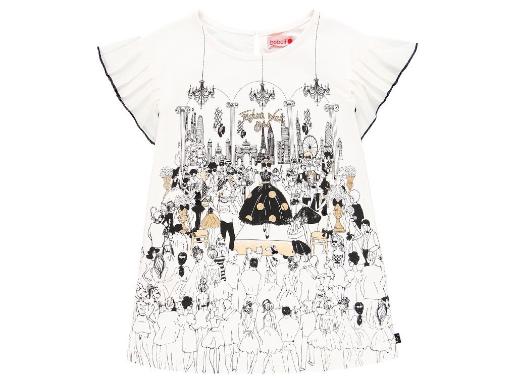 Elegantní bílé dívčí šaty áčkového tvaru s krátkým volánkovým rukávem z jemného šifonu. Kvalitní potisk módní přehlídky s modelkou v kombinaci černé, zlaté a zářivých kamínků. Pro královny letní párty.