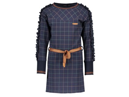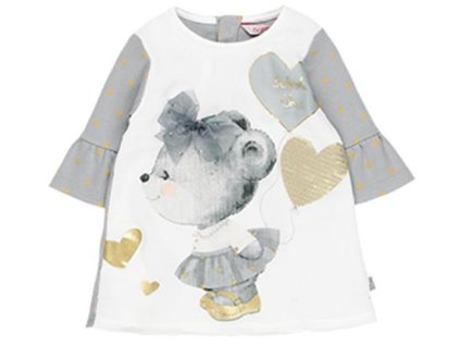 Elegantní dívčí šaty s dlouhým rukávem, z hřejivého jemného úpletu (mohér) a se vsazenou nabíranou tylovou sukničkou, dekorovanou potištěnými zlatými srdíčky (připomíná noční oblohu). Na předním díle dominuje ozdoba ve tvaru srdce, napůl s překlápěcími flitry (zlatá/měděná/tmavě modrá) a drobné šupinky šifónu. Celé šaty jsou tón v tónu tmavě modré. Pro královny plesů od Boboli.