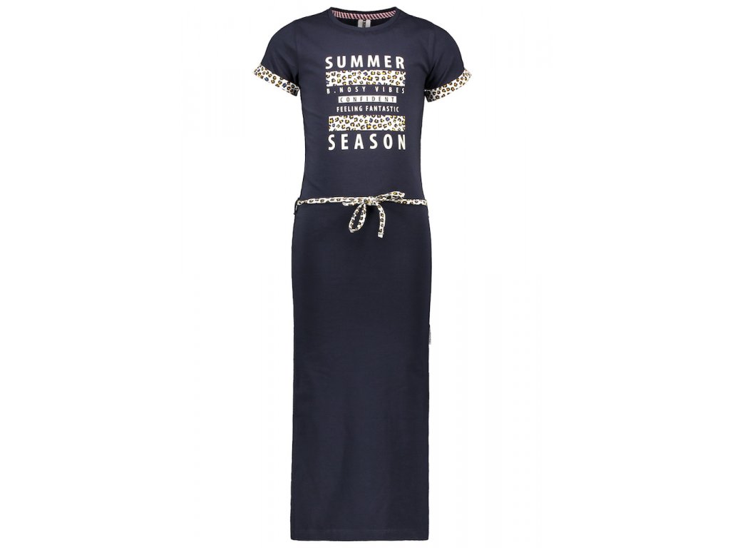Dlouhé bavlněné šaty s krátkým rukávem lemovaným gepardím vzorem. Tmavě modré maxi šaty s rozparky. OEKO-TEX CmiA certifikát. Velmi příjemná pružná bavlna pro maximální komfort od holandské značky pro holky B-Nosy.