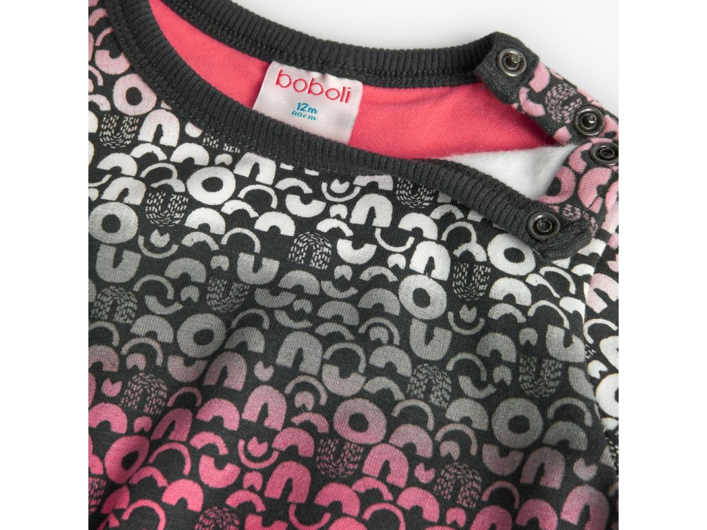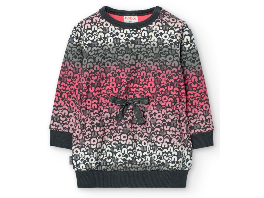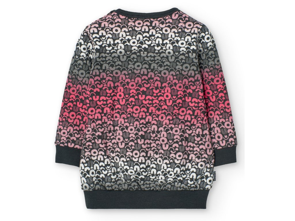 Dlouhá mikina nebo mikinové šaty pro holku se zajímavým potiskem a v pase na stahování. Příjemný materiál a pohodlný střih s pružnými náplety.