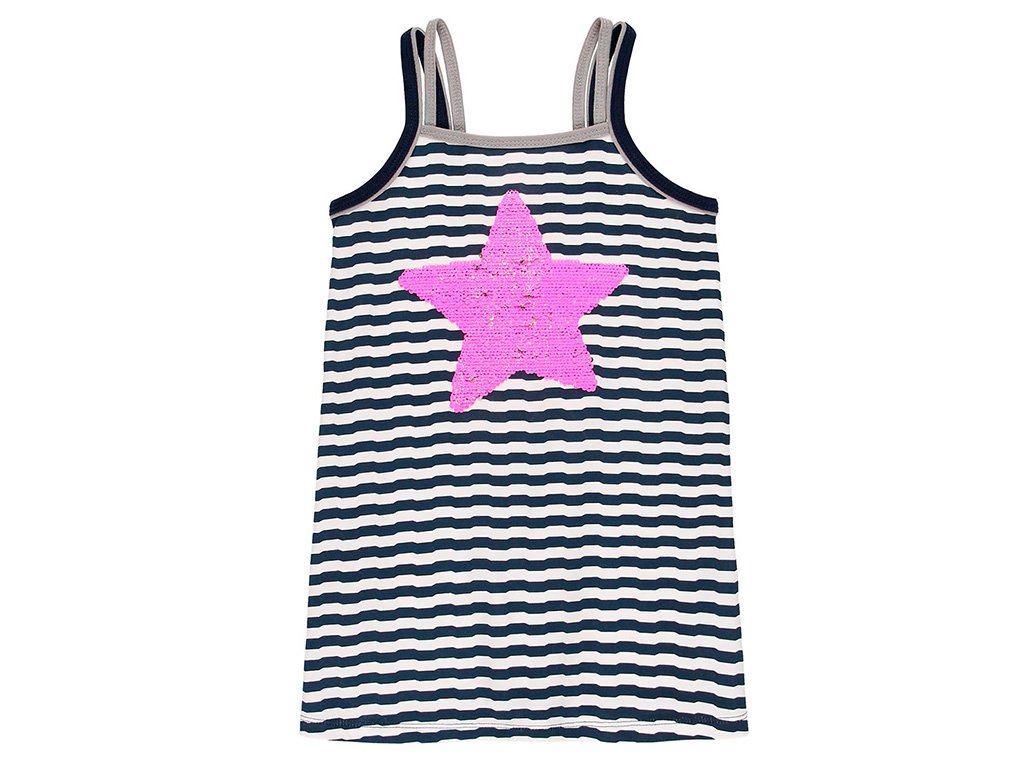 Krátké áčkové šaty na ramínka, modrobíle pruhované s překlápěcími flitry v úžasné růžové barvě na stříbrnou. Velmi příjemný a pružný materiál. Pro královny léta. Do setu s plavkami.