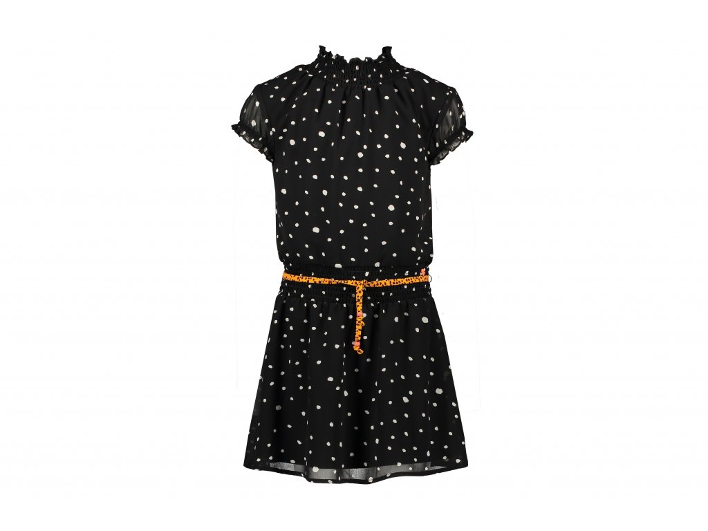 Lehounké černé šaty s bílými puntíky, drobným balónkovým rukávem, žabkovým stojáčkem a pasem s oranžovou gepardí stuhou. Holandská značka NONO.