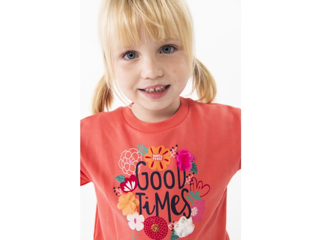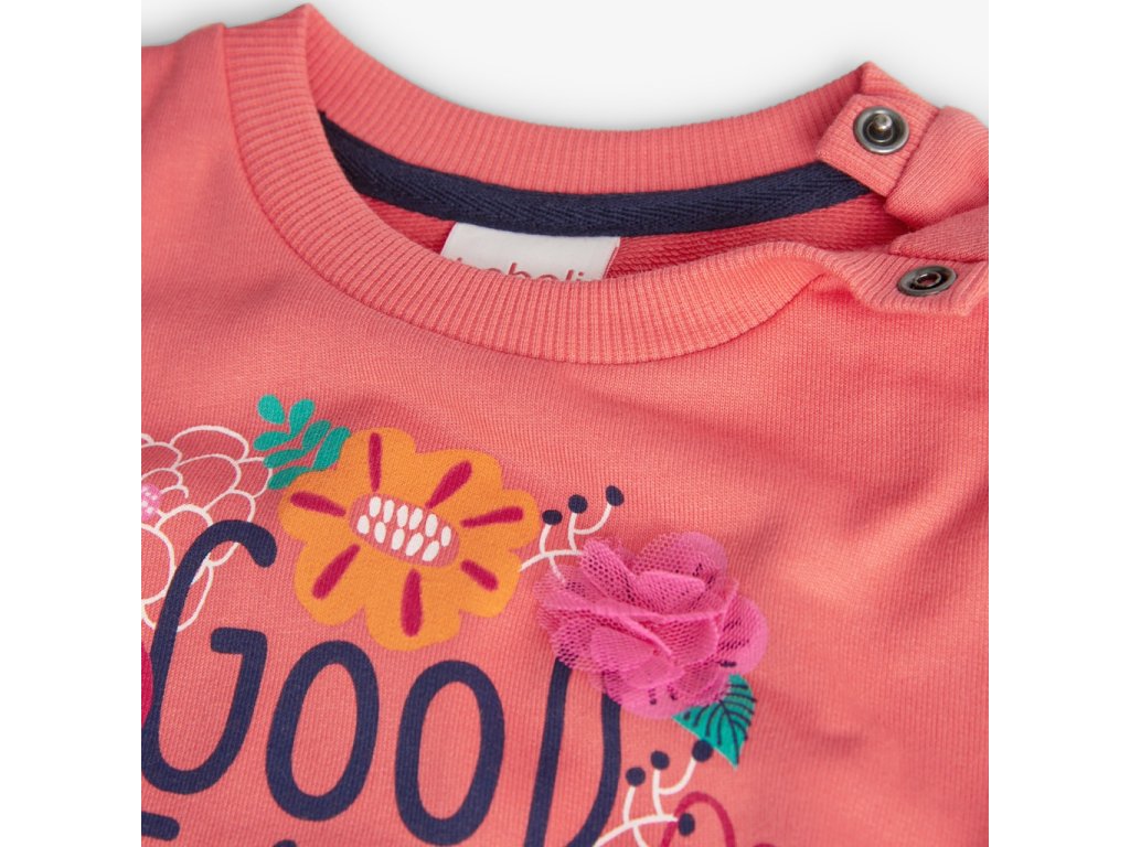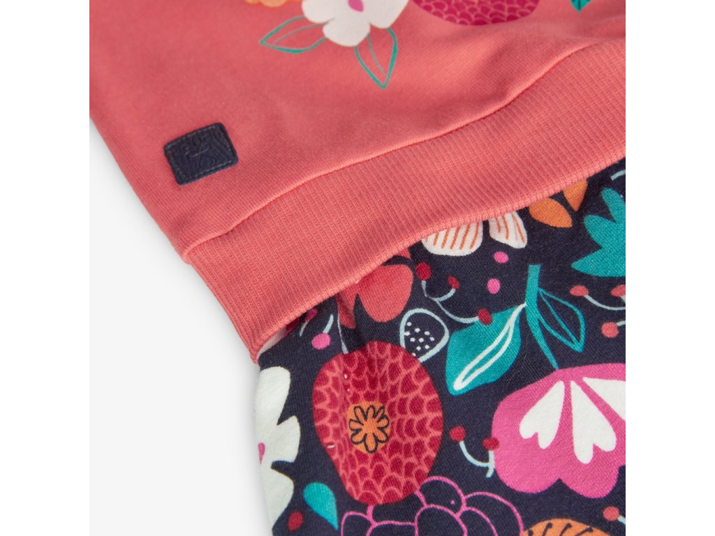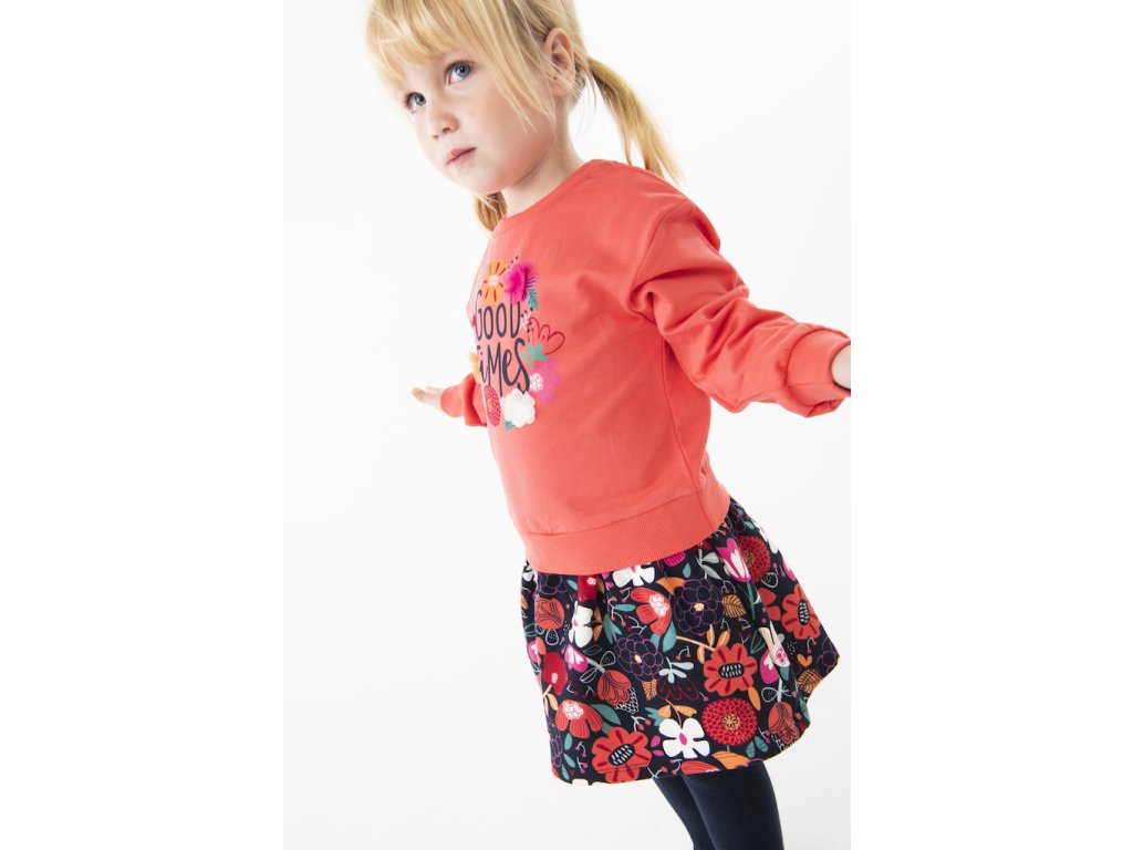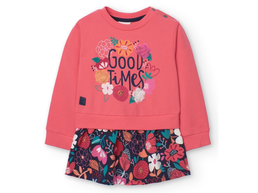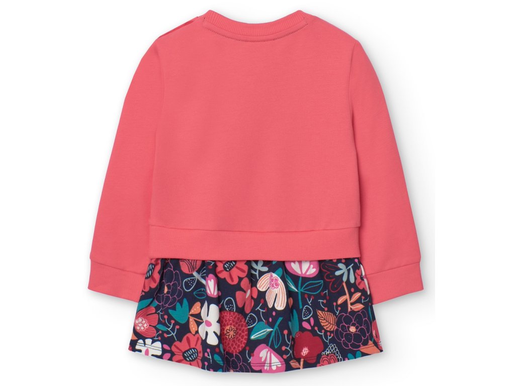 Mikinové dívčí šaty s dlouhým rukávem, s květovanou sukničkou vsazenou do mikiny, dekorovanou barevným potiskem s našitými květy. Příjemná pružná bavlna. Kolekce podzim-zima Flower Power Boboli Španělsko.