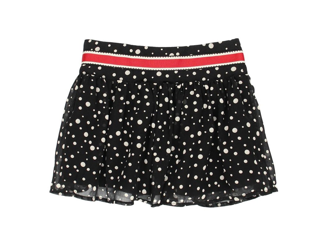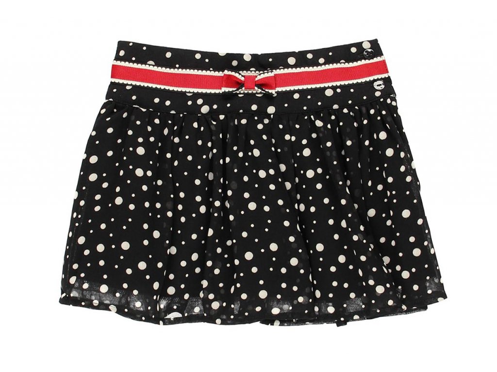 Elegantní černá dívčí sukně s bílými puntíky a širokým ozdobným pasem červenou mašličkou. Skládaná ze tří vrstev. Točící efekt! Do setu s malinovým topem a punčocháčemi.