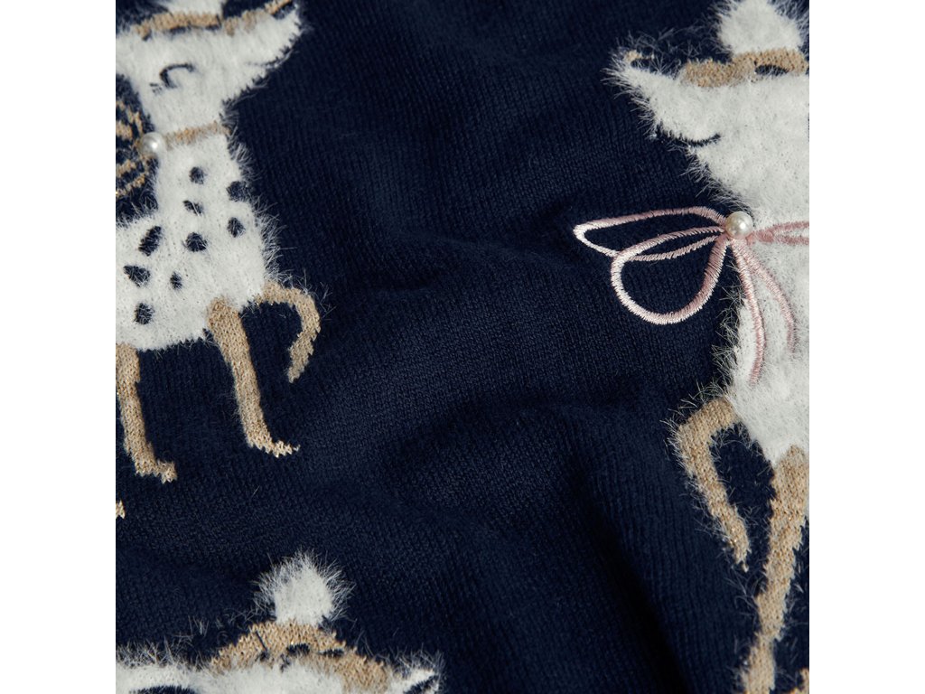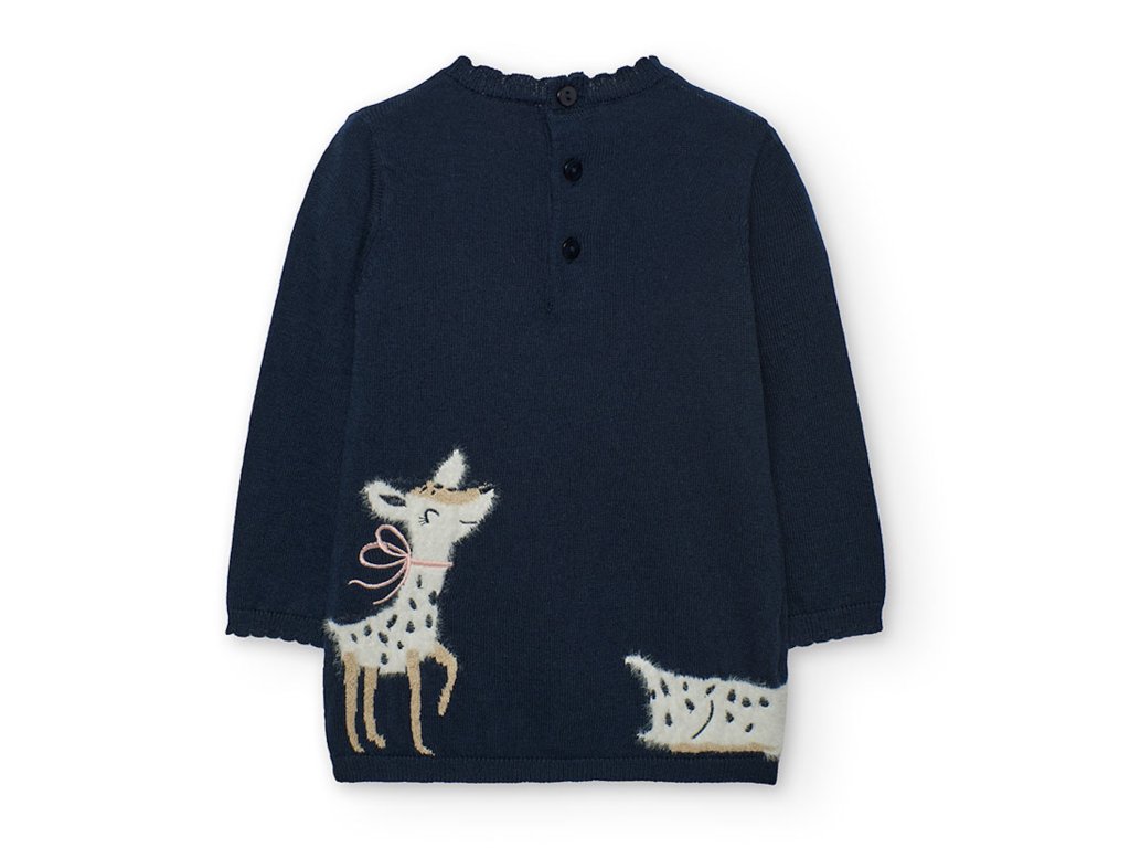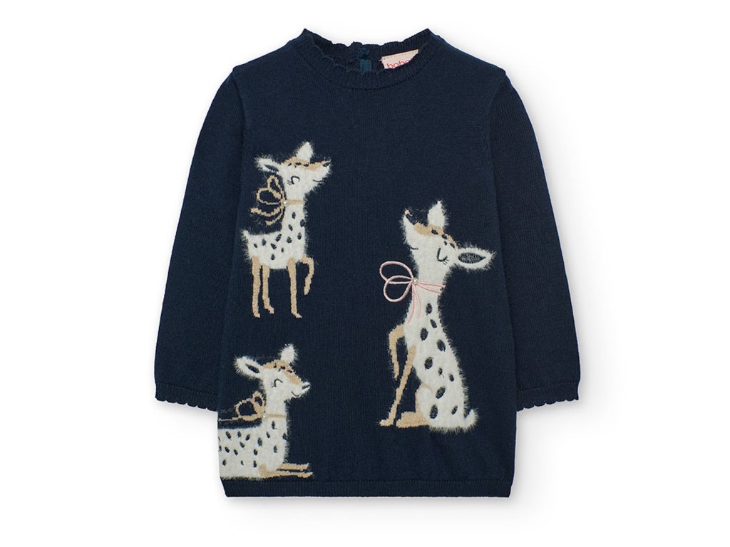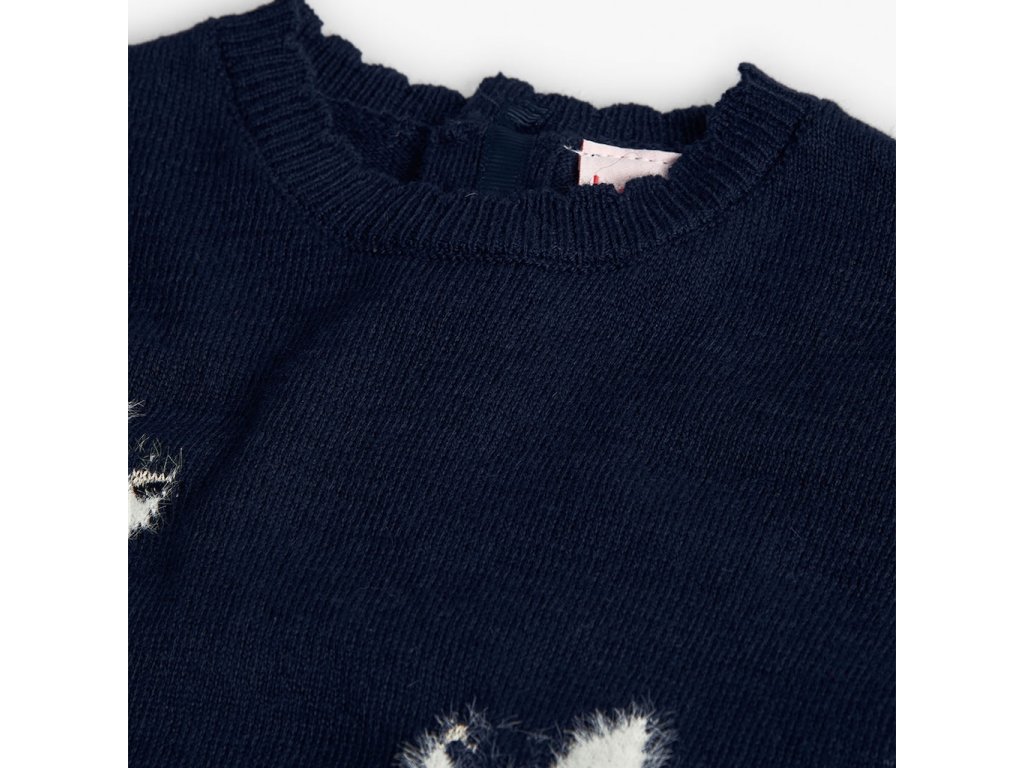 Dívčí pletené šaty tmavě modré barvy s bílou fenečkou (výšivka a chlupaté buklé). Velmi příjemné a měkounké šaty s příměsí vlny. Kolekce pro holku od Boboli, Šúanělsko.