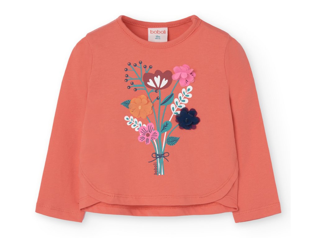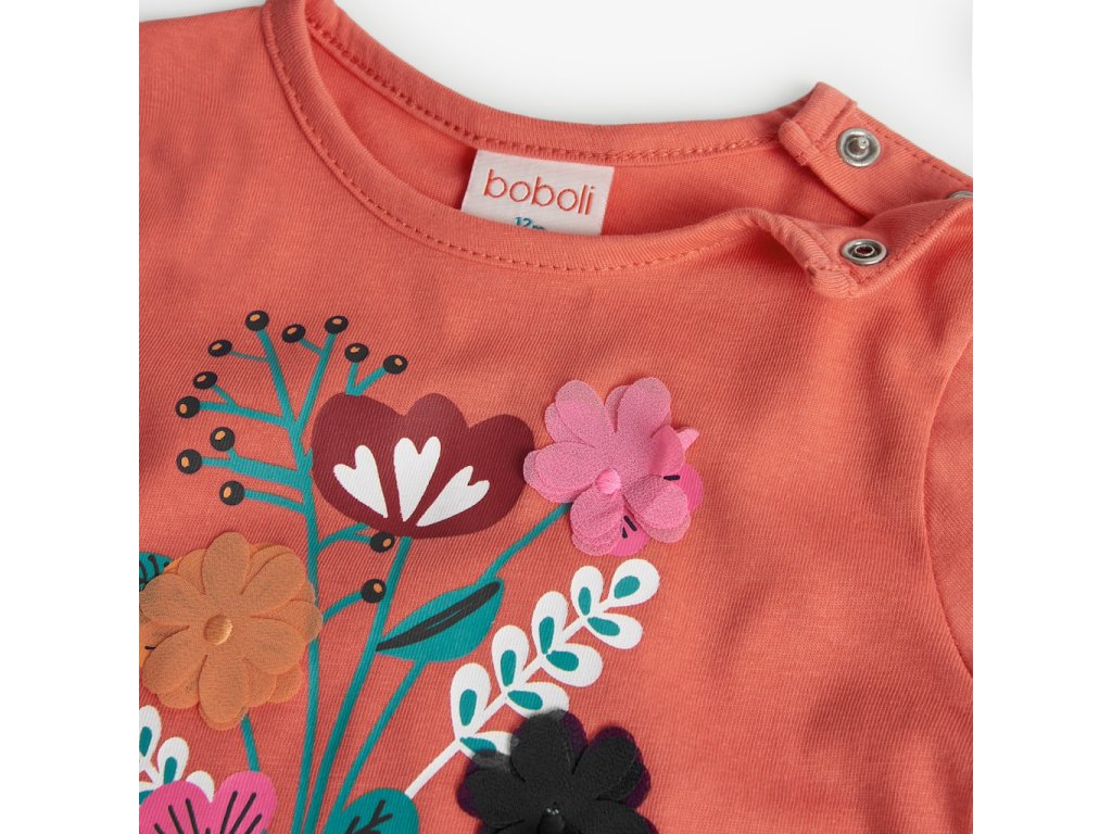 Dívčí tričko s dlouhým rukávem a kombinovaným potiskem květin s našitými kvítky. Příjemná 100% bavlna. Do setu s džegínami a bundou, kolekce Boboli Flower Power.
